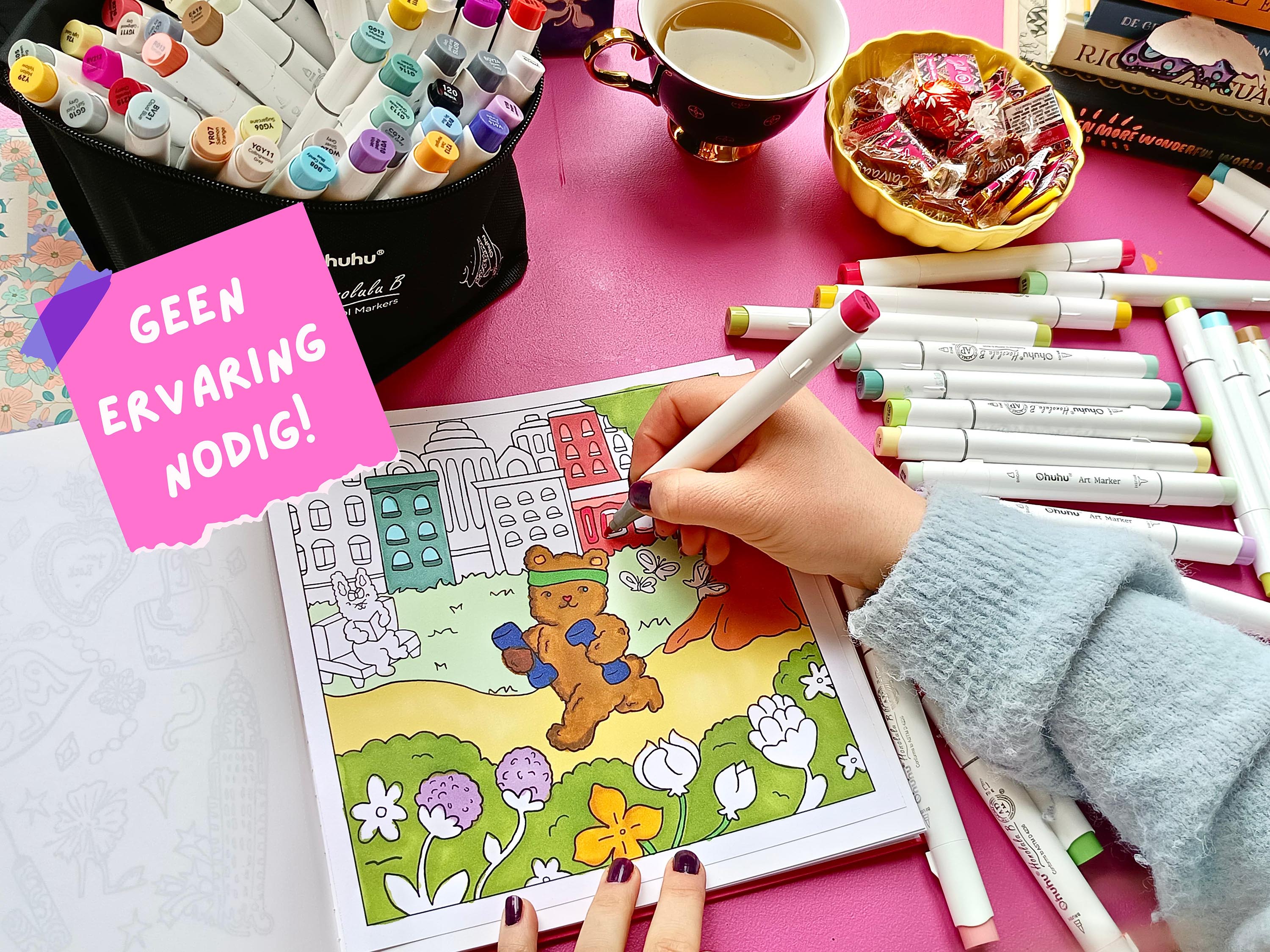 ● Een gezellige en ontspannen tekenervaring in “cozy colouring” stijl